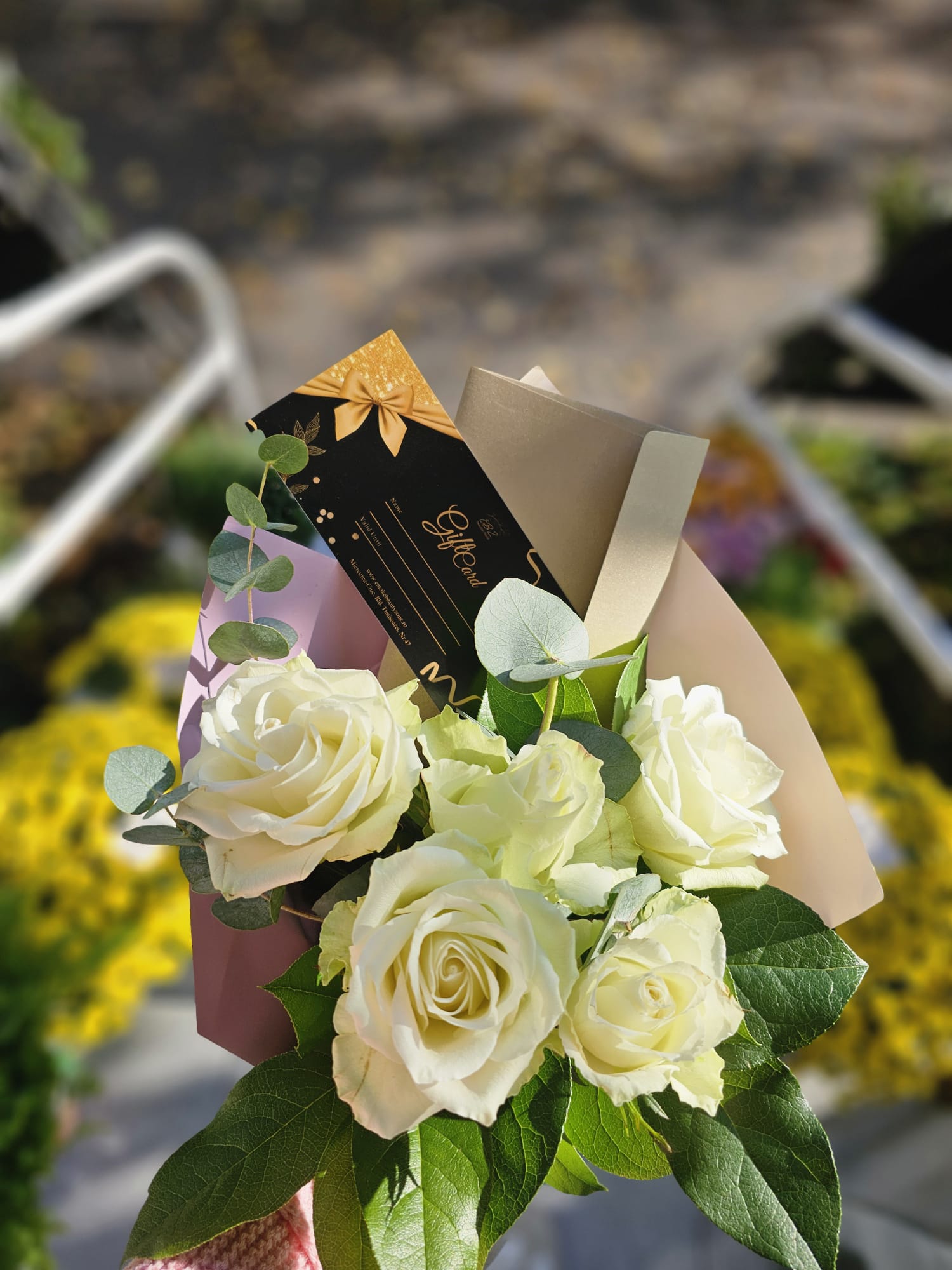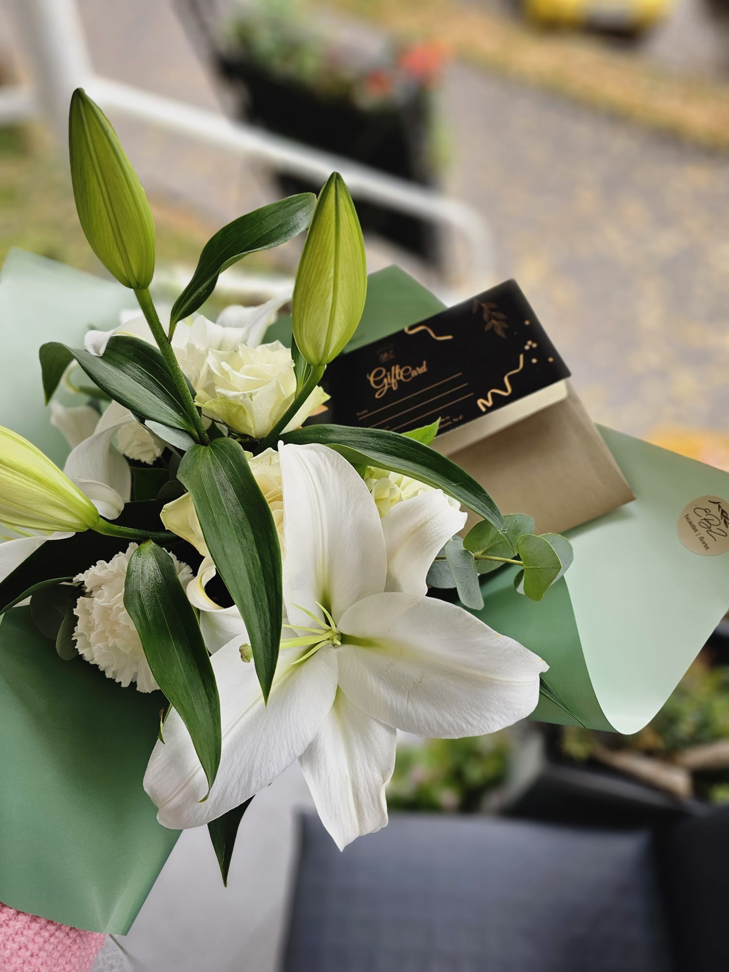 Răsfăț pur și eleganță desăvârșită — buchet de crini albi și voucher HeadSpa – The Essential Ritual, un cadou ce inspiră relaxare și rafinament.