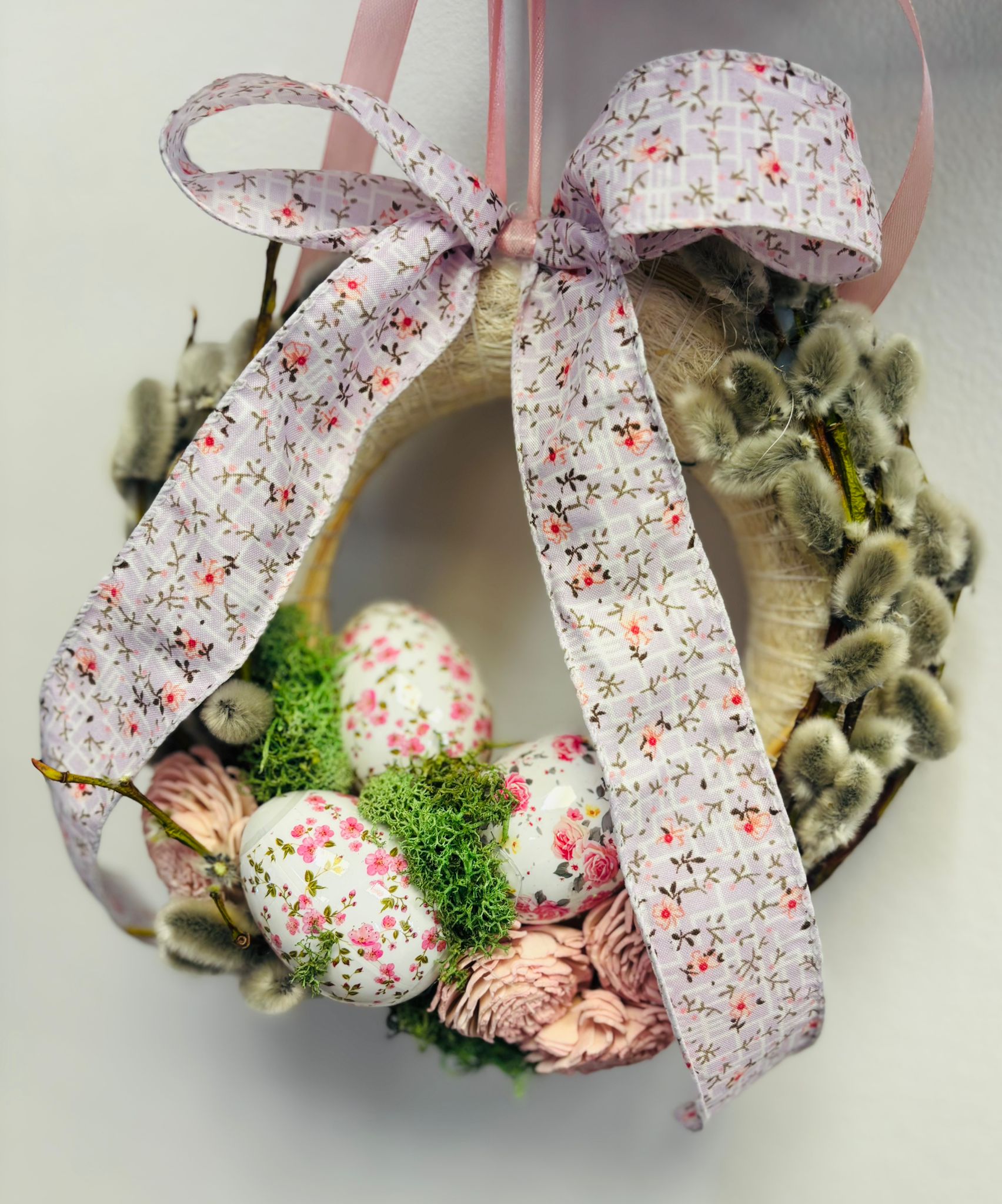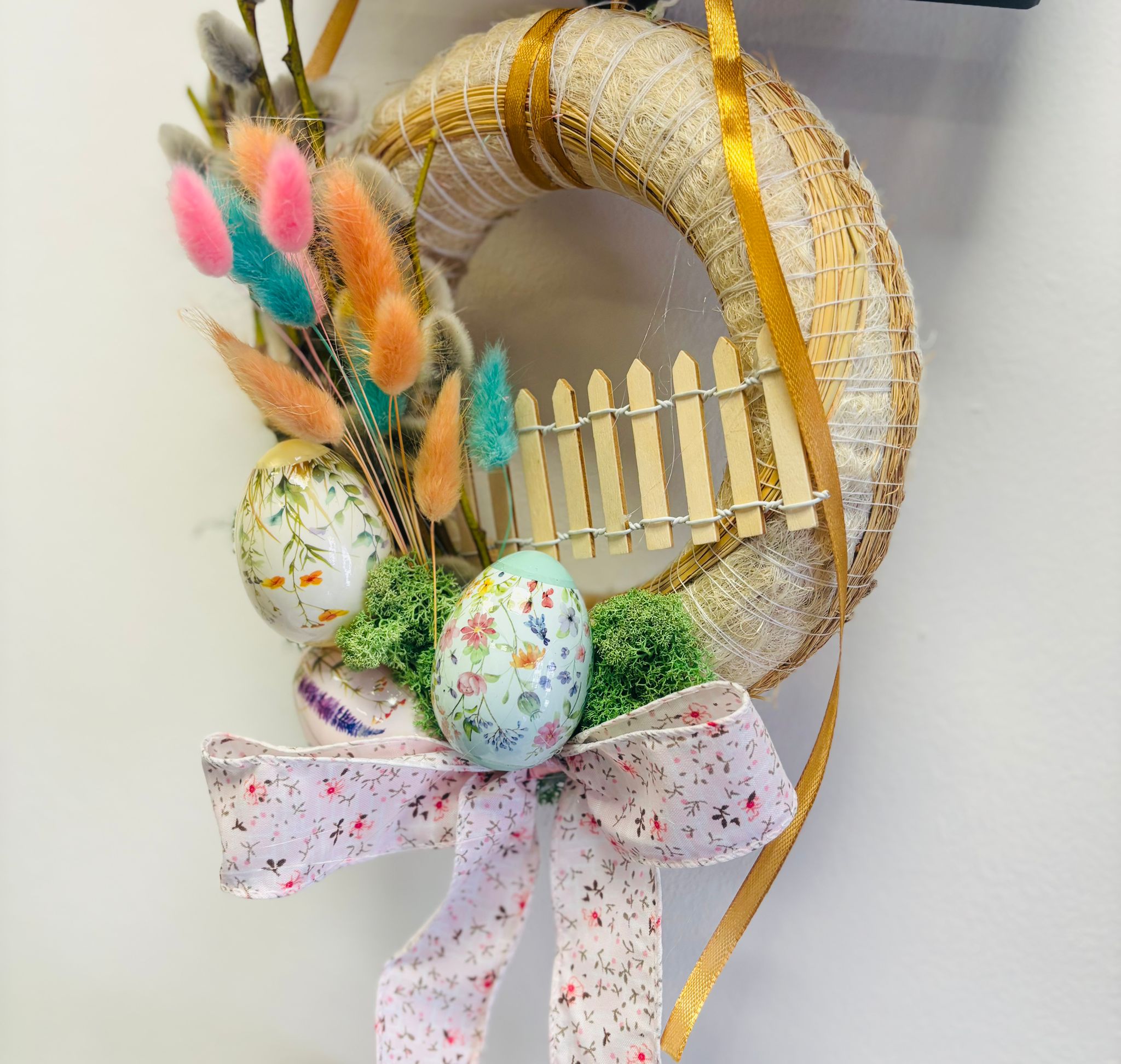 Coroniță decorativă de primăvară cu ouă colorate și elemente naturale, ce aduce instant o atmosferă festivă. Alegerea perfectă pentru Paște sau pentru a întâmpina primăvara în casa ta.