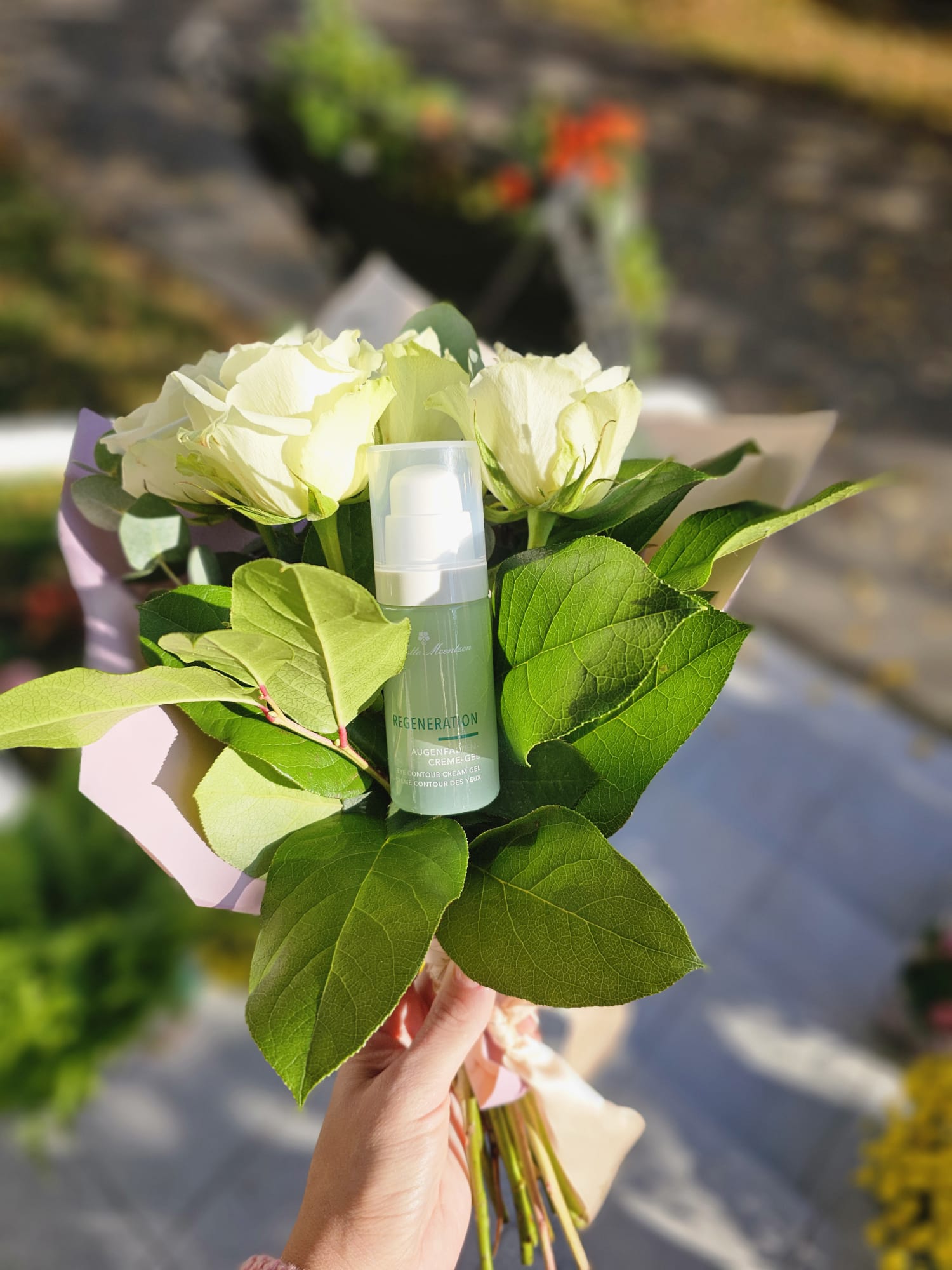 Crema regeneratoare pentru conturul ochilor de la Charlotte Meentzen, care însoțește buchetul, este completarea perfectă pentru un look proaspăt și radiant.